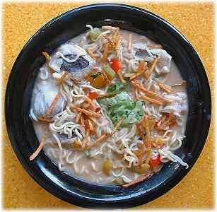 Op deze pagina twee recepten voor noodle soep; Laksa en een simpele noodle soep. LaksaLaksa is een pittige maaltijdsoep uit Singapore. Heb hem daar gegeten in het 'Holland House', en was gelijk verkocht, een pittige smaakvolle soep met kokos. Wat meer bewerkelijk dan de simpele noodle soep verderop deze pagina, omdat ik zelf mijn curry-mengsel heb gemaakt, maar heel smakelijk! Er is geen standaard-recept van laksa, iedereen maakt het toch op zijn eigen manier, dus ik heb ook wat vrijheid genomen om het te doen met wat ik op dit moment in huis heb (had het maken van de soep niet echt gepland, en we hebben hier geen toko in het dorp). Als het resultaat maar geurig, pittig en romig is. De Rempah (curry-pasta)De rempah-pasta is genoeg voor 3 keer, te kleine hoeveelheden malen gaat niet goed in een blender of keukenmachine (wel natuurlijk met de hand in een vijzel). Ik heb een deel (ongeveer 100 ml) gebruikt, en twee delen ingevroren.